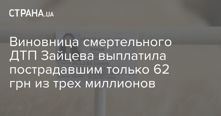 Виновница ДТП с шестью погибшими в Харькове Елена Зайцева, отбывающая 10-летнее заключение в исправительном центре, официально выплатила компенсацию только двум потерпевшим - по 31 гривне "с копейками". Такое заявление сделала адвокат пострадавшей стороны Лариса Матвеева.