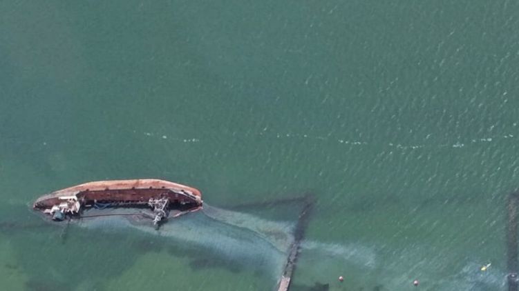 Из танкера Delfi, прибитого к берегу одесского пляжа "Дельфин", выливается топливо. Пятно разлива стремительно увеличилось и даже достигло зоны водоема, в которой купаются отдыхающие.