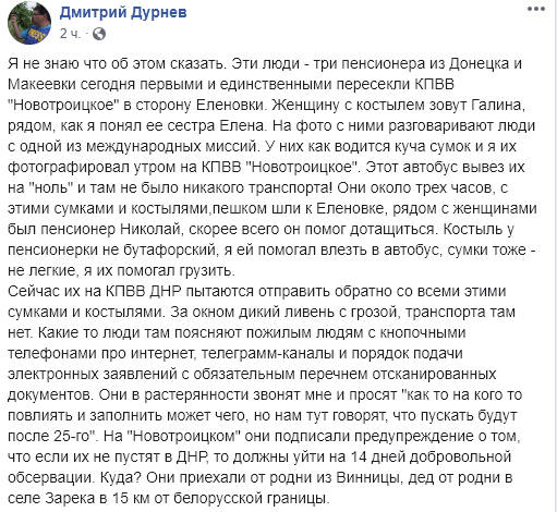 Журналист Дмитрий Дурнев пишет, что сегодня КПВВ Новотрицкое в сторону "ДНР" пересекли три пенсионера, но там их не пропустили, поскольку въезд Донецк разрешит только с 25 июня.