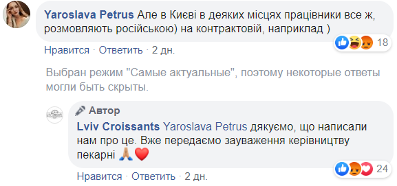 В комментариях к посту львовской пекарни мнения людей разделились. Одни - рассыпались в комплиментах на украинском языке, другие напомнили еще одно правило заведения - кассиры обязаны переходить на язык клиента да и законность Конституции еще никто не отменял.