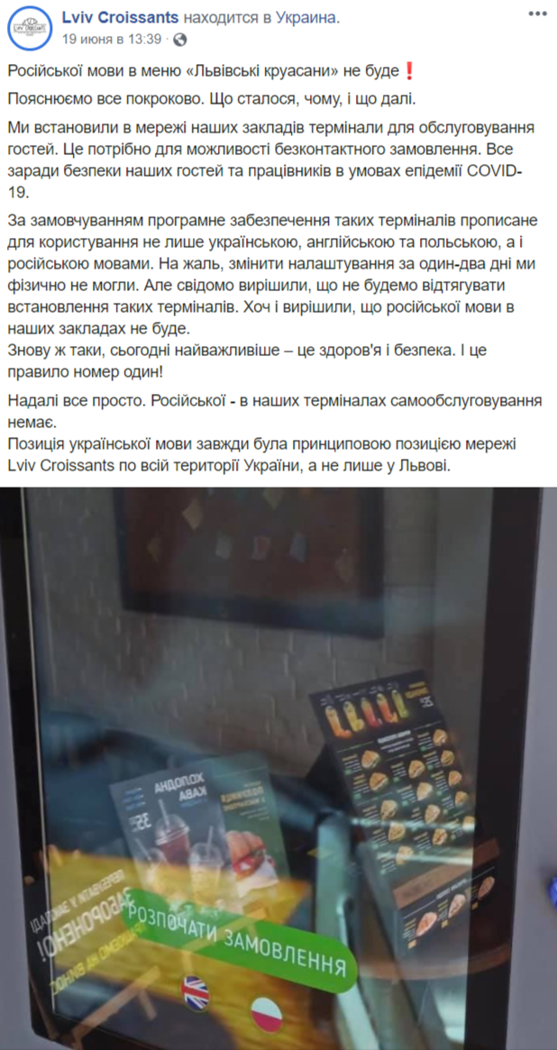 "Далее все просто. Русского - в наших терминалах самообслуживания нет", - победно заявили в Lviv Croissants.