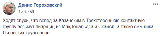 "Ходят слухи, что вслед за Казанским в Трехстороннюю контактную группу возьмут пиарщиц из МакДоналдса и СкайАп, а также сммщика Львовских круассанов", - шутит блогер Денис Гороховский, говоря о том, что со стороны Украины в ТКГ заседают непримиримые националисты.