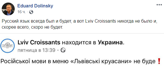 После мовного скандала с украинской сетью McDonald's, которая отказалась предоставлять свои услуги клиентам на русском языке, с аналогичной позицией выступила сеть ресторанов "Львовские круассаны".