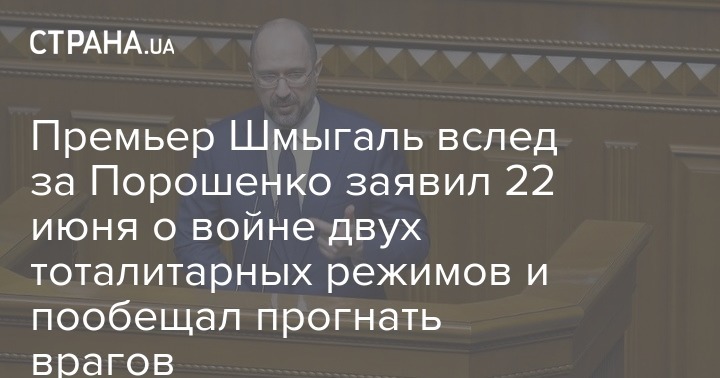 Премьер Шмыгаль вслед за Порошенко заявил 22 июня о войне двух тоталитарных режимов и пообещал прогнать врагов