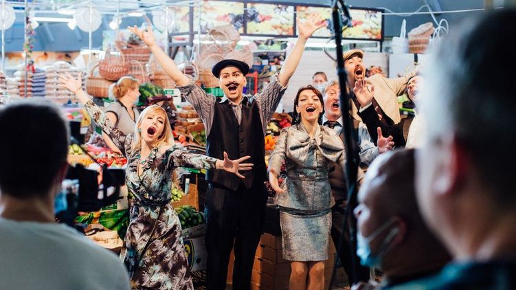 Так, проект под названием "Если ты не идешь в театр - театр приходит к тебе" снят на столичном Житнем рынке. Он демонстрирует, что "духовное питание" не менее важно, чем физическое, и призывает зрителей приходить в театры, как только появится возможность.