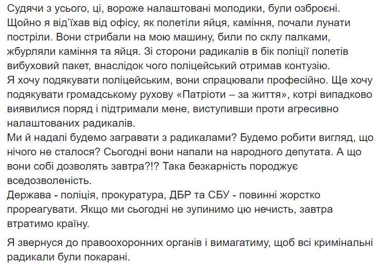 По версии "Нацкорпуса", когда нардеп уезжал с места встречи, "неравнодушные граждане" начали догонять его, чтобы он объяснил свои заявления.
