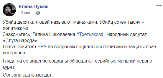 "Убийц десятка людей называют маньяками. Убийц сотен тысяч – политиками. Знакомьтесь, Галина Николаевна #Третьякова , народный депутат, "Слуга народа".