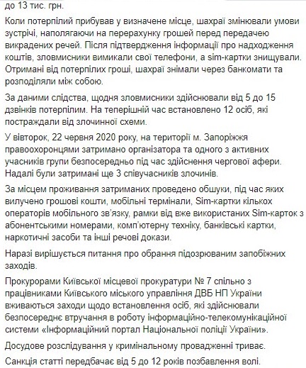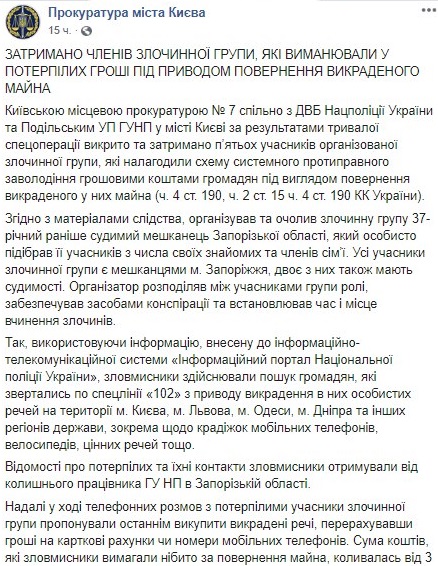 "Киевской местной прокуратурой № 7 совместно с Департаментом внутренней безопасности Нацполиции Украины и Подольским УП ГУНП в городе Киеве по результатам длительной спецоперации найдены и задержаны пять участников организованной преступной группы, которые наладили схему системного противоправного завладения денежными средствами граждан под видом возврата похищенного у них имущества", - указано в сообщении.