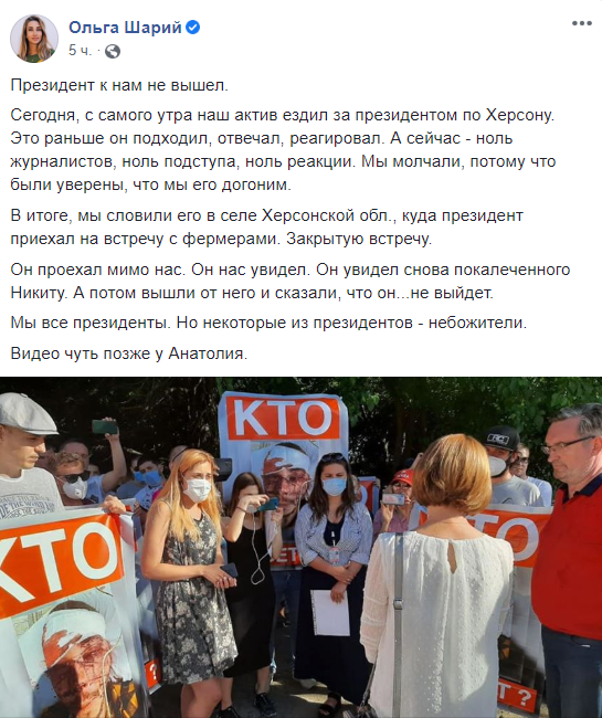 "Президент к нам не вышел, - написала в Facebook Ольга Шарий об акции "Партии Шария", активисты которой пытались узнать мнение президента об избиении координатора партии в Харькове Никиты Роженко. - Сегодня, с самого утра, наш актив ездил за президентом по Херсону. Это раньше он подходил, отвечал, реагировал. А сейчас - ноль журналистов, ноль подступа, ноль реакции. Мы молчали, потому что были уверены, что мы его догоним. В итоге, мы словили его в селе Херсонской области, куда президент приехал на встречу с фермерами. Закрытую встречу. Он проехал мимо нас. Он нас увидел. Он увидел снова покалеченного Никиту. А потом вышли от него и сказали, что он... не выйдет. Мы все президенты. Но некоторые из президентов - небожители".