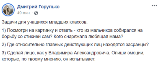 Не обошлось без казусов. От внимательных пользователей не ускользнуло фото, на котором президент с отсутствующим выражением лица стоит на мосту рядом с главой МВД. При этом на ногах у него, забрызганные грязью резиновые сапоги не по размеру. Снимок тут же дал пищу для мемов.