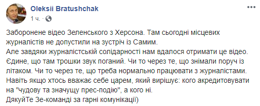 "Запрещенное видео Зеленского из Херсона. Там сегодня местных журналистов не допустили на встречу с Самим. Но благодаря журналистской солидарности нам удалось получить это видео.Единственное, что там немножко звук плохой. То ли оттого, что снимали рядом с самолетом. То ли оттого, что надо нормально работать с журналистами. Даже если кто-то считает себя царем, который решает: кого аккредитировать на "прекрасное и значимое пресс-событие", а кого нет. Спасибо Зе-команде за хорошие коммуникации)" - написал журналист Алексей Братущак.