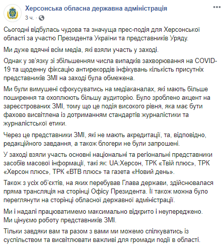 Местные власти уточнили, что аккредитовали только СМИ с наибольшим охватом и аудиторией. Среди них UA:Херсон, ТРК "Твой плюс", ТРК "Херсон плюс", ТРК "ВТВ плюс" и газеты "Новый день".
