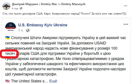 В сети неоднозначно отнеслись к размеру финансовой помощи США Украине в размере 100 тысяч долларов на ликвидацию последствий масштабных наводнений в западных регионах страны.