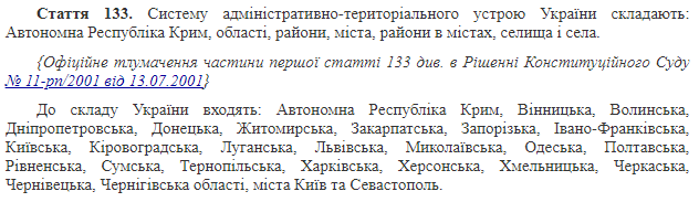 Отметим, что согласно статье 133 Конституции в административном отношении территория Украины включает 27 регионов — 24 области, Автономная Республика Крым и два города, имеющие специальный статус - Киев и Севастополь.