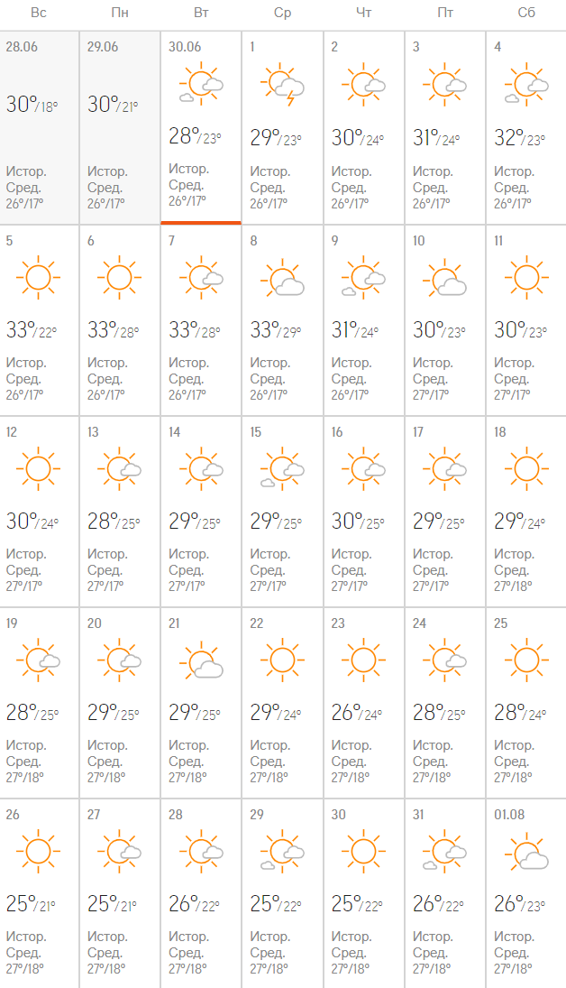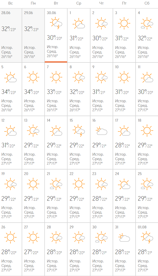 Общая картина месяца в Одессе по данным аccuweather выглядит следующим образом: грозы возможны только 15 июля и 1 августа.