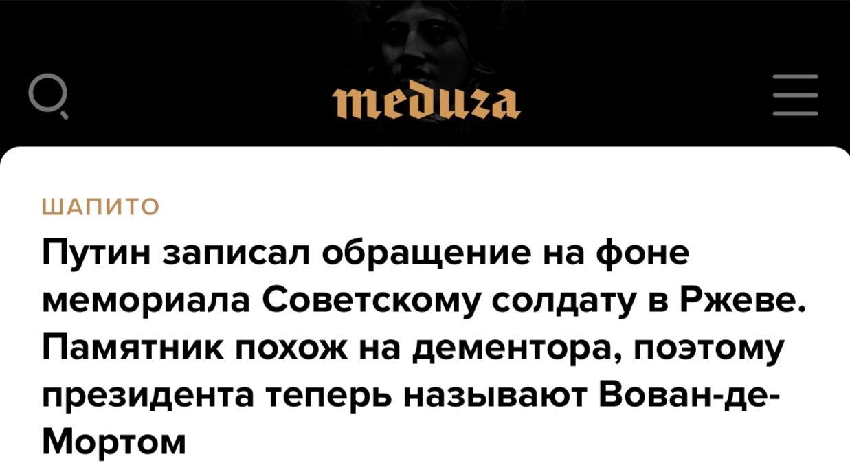 "Путин записал обращение на фоне мемориала Советскому солдату в Ржеве. Памятник похож на дементора, поэтому президента теперь называют Вован-де-Мортом", - гласит заголовок новости, которая размещена в рубрике "Шапито".