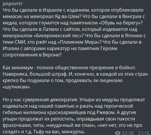 "Что бы сделали в Израиле с изданием, которое опубликовало мемасик на мемориал Яд ва-Шем? Что бы сделали в Венгрии с медиа, которое глумится над памятником "Обувь на берегу"? Что бы сделали в Латвии с сайтом, который издевается над мемориалом "Бикерниекский лес"? Что бы сделали в Японии с теми СМИ, кто ржёт над "Пламенем Мира"? Что бы сделали в Италии с авторами карикатур на памятник Героям сопротивления в Вероне?