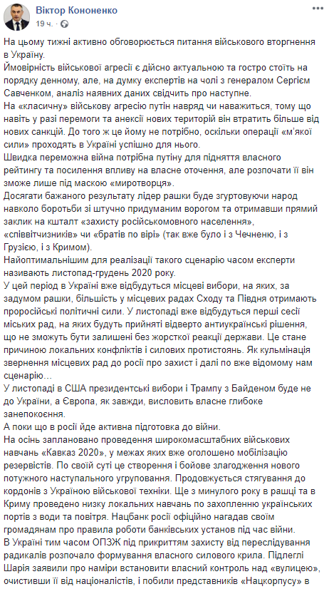 Сама атака, по мнению Кононенко, намечена на ноябрь-декабрь, чему, по его мнению, будут способствовать еще два обстоятельства. Во-первых, проведение местных выборов в Украине, на которых, как прогнозирует экс-замглавы СБУ, в юго-восточных регионах победят "пророссийские силы" и возьмут под своей контроль облсоветы и горсоветы. Во-вторых, внутренняя напряженность в США в связи с президентскими выборами и подведением их итогов, когда американцам будет не до Украины.