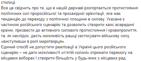 Бывший замглавы СБУ Виктор Кононенко (считался одним из наиболее приближенных к Порошенко руководителей СБУ), например, считает, что поводом станут акции оппозиции, ("Оппозиционная платформа", "Партия Шария"), которая вступит в силовое противостояние с "патриотами" вроде "Нацкорпуса", что расшатает ситуацию в стране и даст Путину формальный повод ввести войска в качестве миротворцев (к слову, по логике Кононенко выходит, что "Нацкорпус", нападая на оппозицию, фактически реализует план России по дестабилизации Украины).