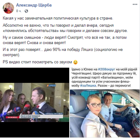 "Едем с Юлей на 208 округ на моей родной Черниговщине. Спасибо за поддержку ей, всей команде партии "Батькивщина", моей команде Радикальной партии и всем участникам флеш-моба #заЛяшка. Вместе - к победе!" - подписал Ляшко снимок.