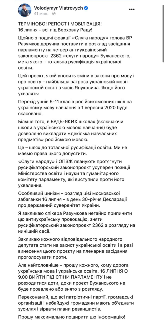 Отметим, что внесение этого проекта в повестку дня вызвало неприятие во фракции "Европейская солидарность", где заявили, что это "тотальная русификация украинского образования" и "главная угроза украинскому языку". Бывший глава Института национальной памяти Владимир Вятрович, ныне депутат от "ЕС" на своей странице в Facebook написал, что созывает всеобщую мобилизацию под парламент, чтобы "сорвать планы реваншистов".
