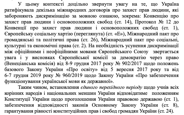 Как говорится в выводе ГНЭУ, "Установление единого переходного периода для учеников всех коренных народов или национальных меньшинств Украины будет соответствовать положениям Конституции Украины относительно провозглашения Украиной правовым государством (ст. 1), обеспечит соответствие законов Основному Закону Украины (ст. 8), обеспечит равенство конституционных прав и свобод граждан Украины (ст. 24)".
