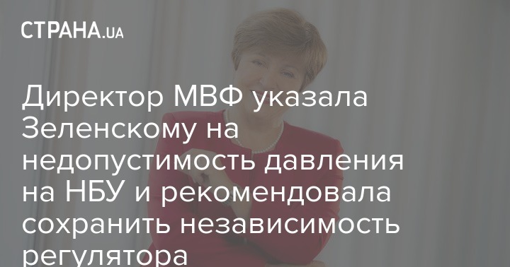 "В интересах Украины сохранить независимость НБУ, и это также является требованием в рамках текущей программы, поддерживаемой МВФ. Я призвала президента Зеленского придерживаться курса разумной денежно-кредитной и финансовой политики - это ключ к более активному инвестированию и инклюзивному росту", - отметила глава МВФ.