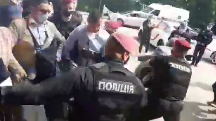 Как выяснилось позже, полицейские были против того, чтобы участники демонстрации выносили мешки под Раду, так как неизвестно, что находится внутри них.