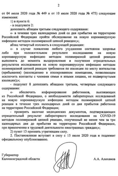 Например, постановление главного санврача РФ ввел в действие губернатор приграничной Калининградской области Антон Алиханов. Он подписал документ вчера, 15 июля (опубликован ниже).