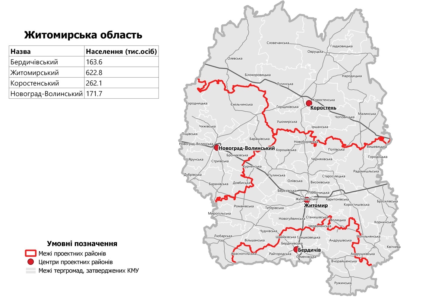 Коростенский район (с административным центром в городе Коростень) в составе территорий Белокоровицкой сельской, Гладковицкой сельской, Горщиковской сельской, Иршанскойпоселковой, Коростенской городской, Лугинской поселковой, Малинской городской, Народицкой поселковой, Овруцкой городской, Олевской городской, Словечанской сельской, Ушомирской сельской, Чоповицкой поселковой территориальных общин;