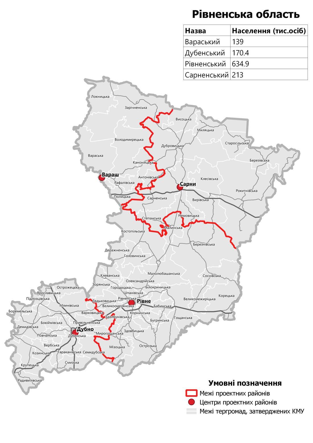 Ровенский район (с административным центром в городе Ровно) в составе территорий Бабинской сельской, Березнивской городской, Белокриницкой сельской, Бугринскои сельской, Великомежирицкои сельской, Великоомелянской сельской, Головинский сельской, Городецкой сельской, Гощанской поселковой, Деражненской сельской, Дядьковицькои сельской, Здовбицкои сельской, Здолбуновской городской, Зорянской сельской, Клеванской поселковой, Корецкой городской, Корнинсклй сельской, Костопольской городской, Малинской сельской, Малолюбашанской сельской, Мизоцкой поселковой, Александрийской сельской, Острожской городской, Ровенской городской, Сосновской поселковой, Шпанивскои сельской территориальных общин;
