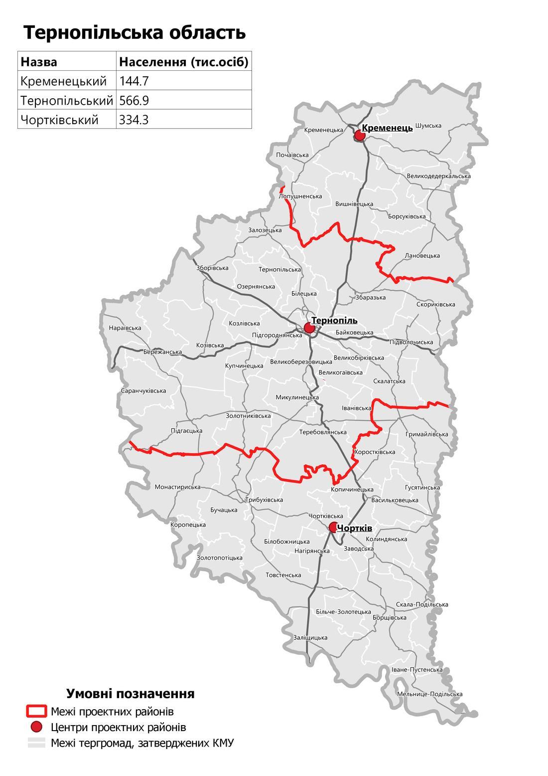 Тернопольский район (с административным центром в городе Тернополь) в составе территорий Байковецькои сельской, Бережанской городской, Билецкой сельской, Великоберезовицкой поселковой, Великобиркивской поселковой, Великогаивскои сельской, Залозецкой поселковой, Збаражской городской, Зборовской городской, Золотникивскои сельской, Ивановской сельской, Козивской поселковой, Козливской поселковой, Купчинецькои сельской, Микулинецкой поселковой, Нараивськои сельской, Озернянской сельской, Подволочиск поселковой, Подгаецкой городской, Подгороднянской сельской, Саранчукивской сельской, Скалатской городской, Скорикивскои сельской, Теребовлянской городской, Тернопольской городской территориальных общин;