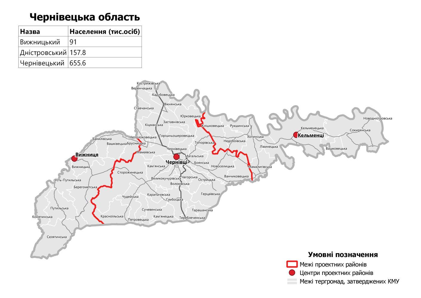 Черновицкий район (с административным центром в городе Черновцы) в составе территорий Боянской сельской, Ванчиковецкой сельской, Великокучуровской сельской, Веренчанской сельской, Викнянской сельской, Волокивскои сельской, Герцаевской городской, Глыбокской поселковой, Горишньошеровецкои сельской, Заставненской городской, Кадубовецькои сельской, Каменецкой сельской , Каменской сельской, Карпачовской сельской, Кицманской городской, Кострыжевской поселковой, Красноильской поселковой, Магальськой сельской, Мамаевской сельской, Неполоковецкий поселковой, Новоселицкой городской, Острицкои сельской, Петровецкои сельской, Ставчанской сельской, Сторожинецкой городской, Сучевенскои сельской, Тарашанскои сельской, Тереблеченской сельской , Топоровской сельской, Чагорской сельской, Черновицкой городской, Чудейской сельской, Юрковецкой сельской территориальных общин.