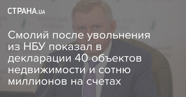 После того, как председатель Национального банка Украины Яков Смолий ушел в отставку, он подал обязательную декларацию после увольнения. В ней он отобразил доходы с 1 января по 3 июля 2020 года (на момент увольнения) и имущество, которое у него было на тот день. Всего у Смолия 41 объект недвижимости - офисы, земельные участки, дома и квартиры, а также почти 120 миллионов гривен на счетах.