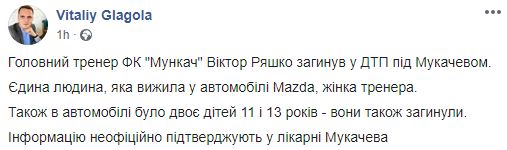 "Единственный человек, выживший в автомобиле Mazda - жена тренера. Также в автомобиле было двое детей 11 и 13 лет - они также погибли. Информацию неофициально подтверждают в больнице Мукачево", - пишет журналист.