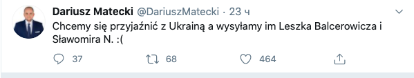 "Мы хотим дружить с Украиной и отправляем им Лешека Бальцеровича (был в Кабмине представителем президента Порошенко, который позвал его в качестве "шокового терапевта", - прим. ред.) и Славомира Н. :(".