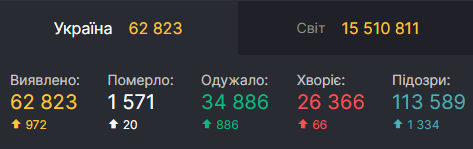 По состоянию на утро пятницы, 24 июля, в Украине коронавирус подтвердился еще у 972 человек. Общее число зараженных таким образом достигло отметки 62 823 с начала эпидемии. Вчера, 23 июля, общее число зараженных в нашей стране составляло 61 851 человек.
