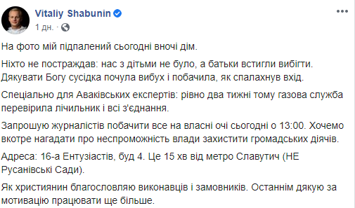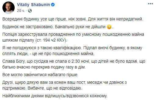 "Поджог ночью дома, в котором спят люди, - это не о повреждении имущества. Слава Богу, что соседка не спала в 2:30 ночи, что детей не было дома, что отец вовремя перекрыл подачу газа в дом. Все могло закончиться гораздо хуже" - написал он.