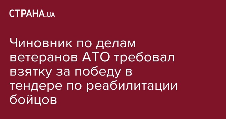 Прокуратура Киева совместно со Службой безопасности Украины задержали чиновника Государственной службы по делам ветеранов войны и участников антитеррористической операции (АТО) при получении 230 тыс. гривен взятки. Деньги  от коммерческой структуры  должны были стать залогом победы этой фирмы в тендере по психологической реабилитации участников АТО.
