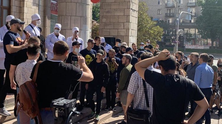 В то же время, под здание Нацсовета пришли представители Нацкорпуса и С14, которые попытались сорвать акцию. Радикалы начали толкать и кричать на журналистов и тех, кто пришёл поддержать акцию. Однако в дело вмешалась полиция и оградила участников от нападавших националистов. Их лидер Евгений Карась кричал, что на акции собрались все сепары.