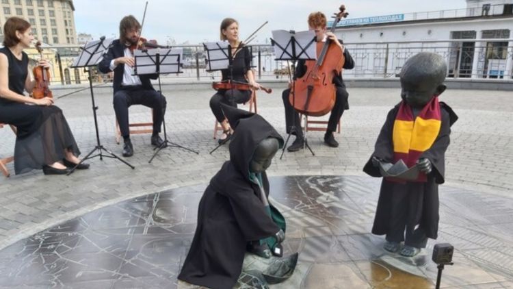 Статуи малышей на Почтовой площади столицы приодели в одежды двух факультетов школы волшебников Хогвартс – Грифиндора и Слизерина.