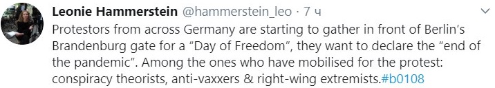 Правоохранители насчитали около 15 тысяч участников, всего в столице Германии на выходные запланировано 83 протеста, часть из которых - против карантина. Одна из акция прямо указывает на теорию заговора вокруг коронавируса.