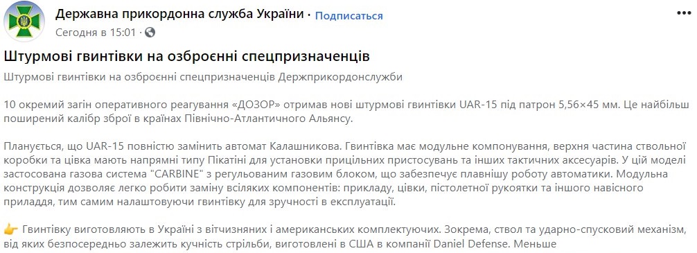 "10 отдельный отряд оперативного реагирования "ДОЗОР" получил новые штурмовые винтовки UAR-15 под патрон 5,56×45 мм. Это наиболее распространенный калибр оружия в странах Североатлантического альянса. Планируется, что UAR-15 полностью заменит автомат Калашникова. Винтовка имеет модульную компоновку, верхняя часть ствольной коробки и цивьё имеют направляющие типа Пикатини для установки прицельных приспособлений и других тактических аксессуаров", - указано в сообщении.