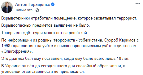 Первым личность террориста раскрыл замминистра МВД Антон Геращенко. Он назвал имя и дату рождения – Сухроб Рахматович Каримов, 1988 года рождения. По словам Геращенко, судя по соцсетям Каримова, он может быть психически неуравновешенным.