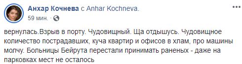 "Куча квартир и офисов в хлам, про машины молчу. Больницы Бейрута перестали принимать раненых - даже на парковках мест не осталось".