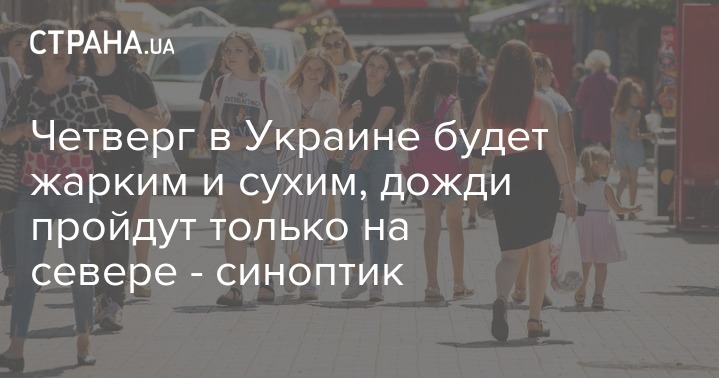 "Температура воздуха в Украине будет высокой, +28...+33 градуса, на юге и на востоке местами до +35 градусов. В Киеве четверг обещает быть сухим солнечным, с температурой воздуха +30...+32 градуса. На выходных в Киеве градусы немного спустятся вниз, к более комфортным, +25...+27. Дождей пока не видно", - сообщила Диденко.