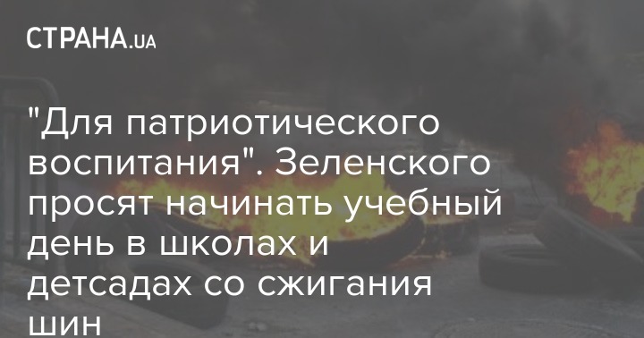 Президенту Украины Владимиру Зеленскому подали петицию с просьбой начинать учебный день в школах и детских садах со сжигания шин для патриотического воспитания. Ее автором выступил Бураков Виталий. На данный момент, за сутки, она собрала 40 из 25 000 нужных голосов.