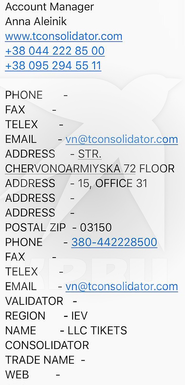 При этом в качестве консолидатора данной группы билетов в системе бронирования указана Анна Алейник, телефоны +380442228500 и +380952945511.