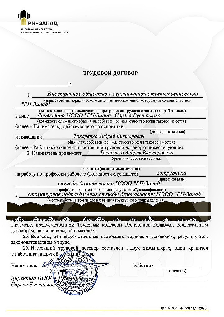 Заезжая в Беларусь, первая партия ЧВК-шников предъявила договора на работу компании "Роснефть-Запад", которые впоследствии оказались липовыми, с поддельными печатями, утверждает "КП", сравнив подписи директора Рустамова на "договоре" поддельном и настоящем.