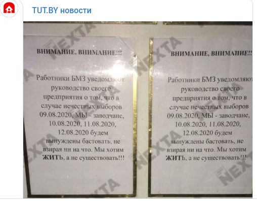 14:51 TUT.by в своем телеграм-канале пишет, что на Белорусском металлургическом заводе в Жлобине забастовка. На проходной висит объявление,что в случае нечестных выборов рабочие будут бастовать с 10 по 12 августа.